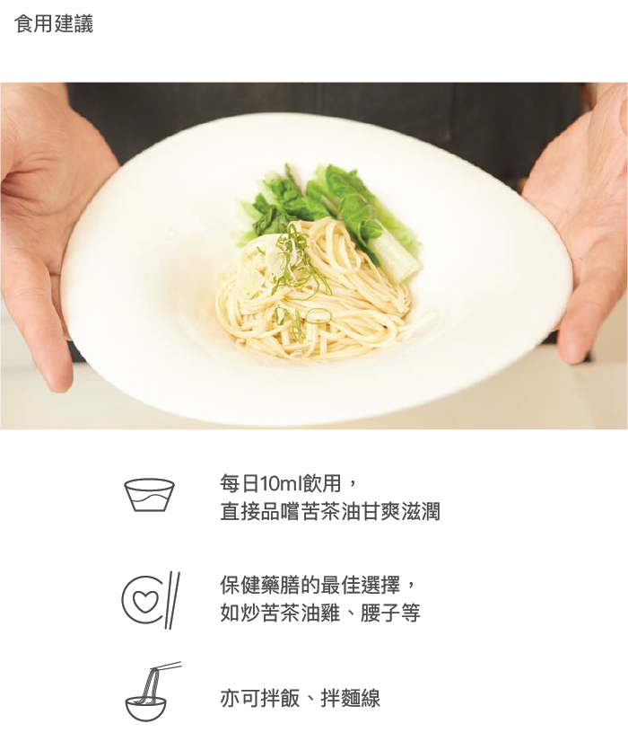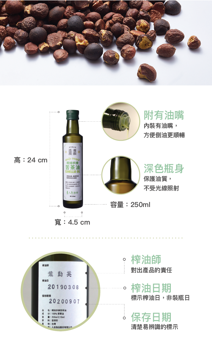 內容物:100%第一道冷壓初榨苦茶油
