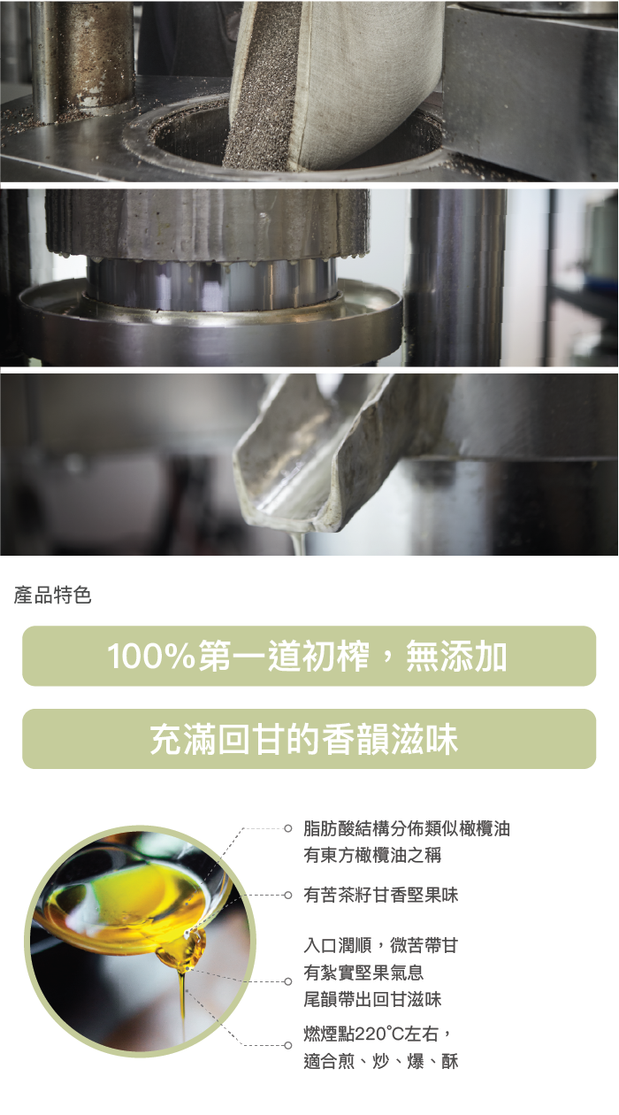 - 純物理重力壓榨,萃取第一道冷壓初榨油