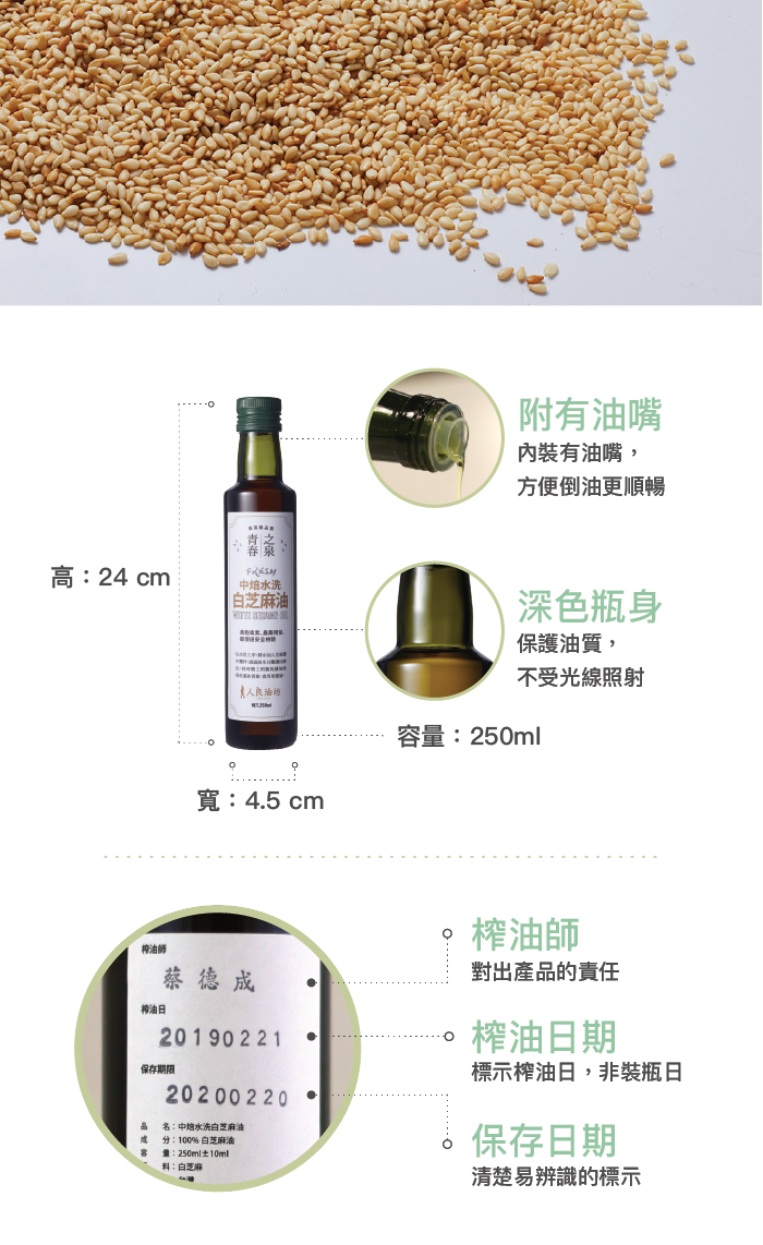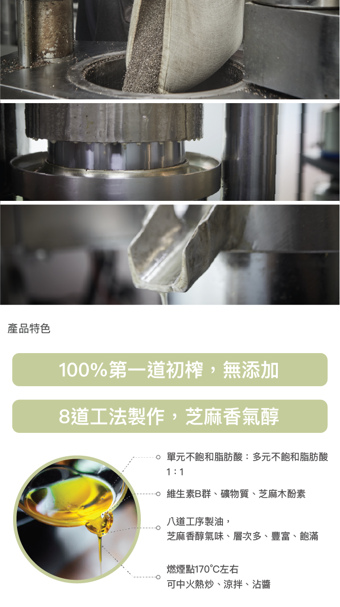 - 100%白芝麻榨取之芝麻油,又稱香油