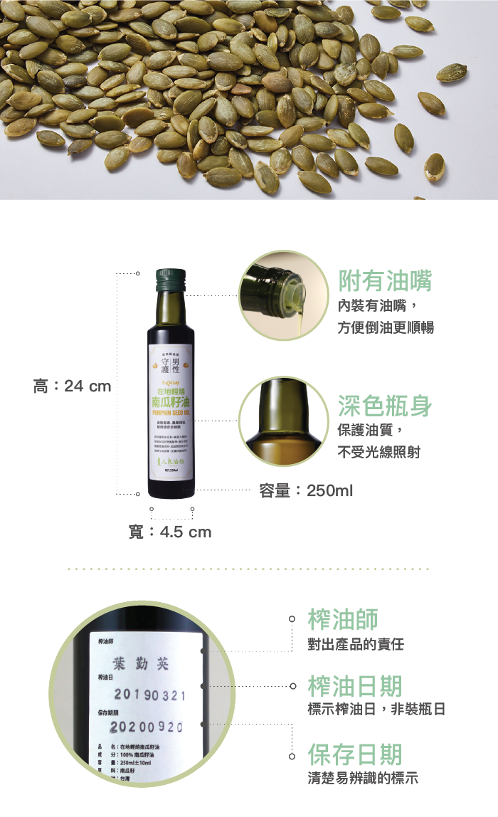 內容物:100%第一道冷壓初榨南瓜籽油