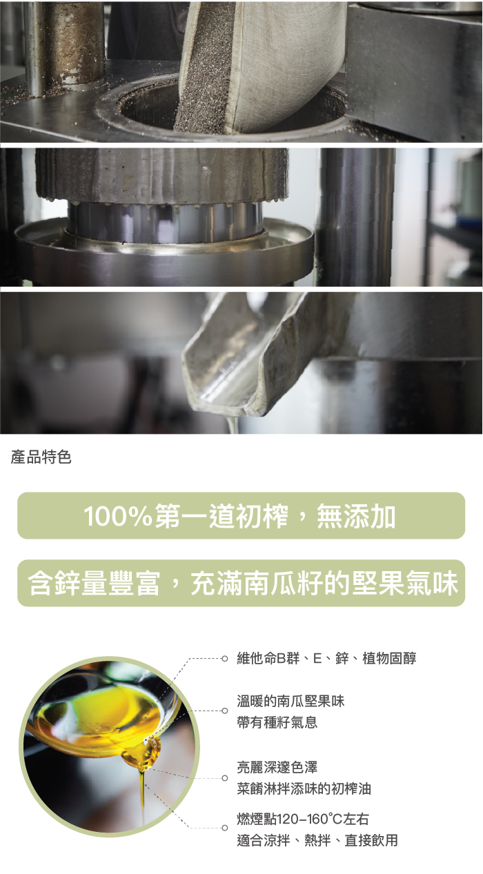 - 純物理重力壓榨,萃取第一道冷壓初榨油