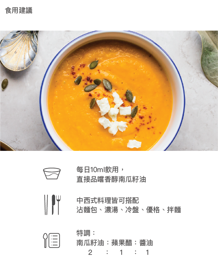 <男性及長輩日常呵護首選> 初榨南瓜籽油含植物固醇,維他命E,和類胡蘿蔔素等天然營養,有助於調整體質調節生理機能。另外南瓜籽油特別是含鋅,適合男性使用,也是長輩及中年婦女的日常呵護首選,適合每天飲用補充營養。