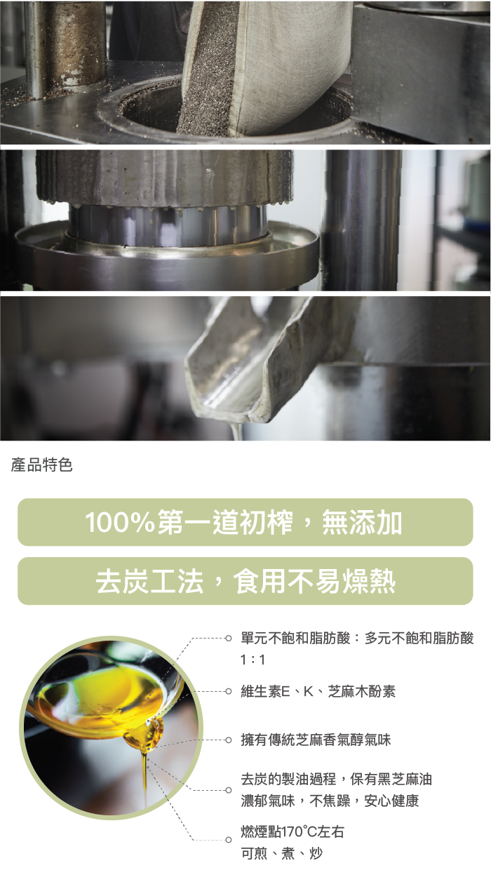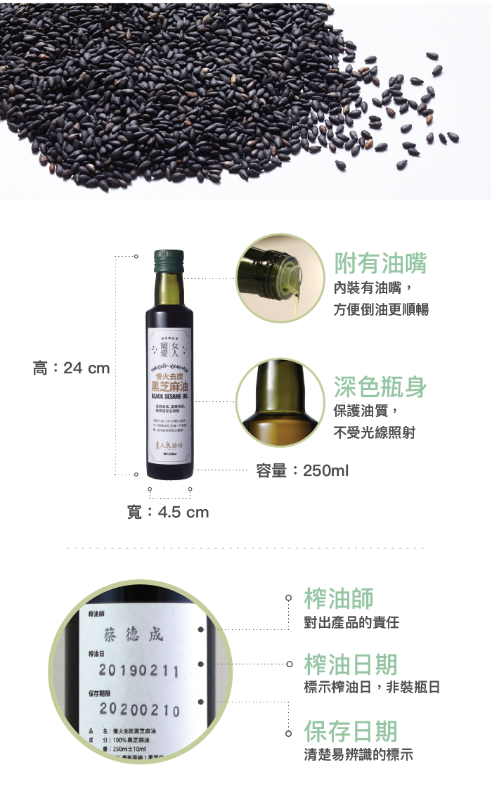 內容物:100%第一道冷壓初榨黑芝麻油