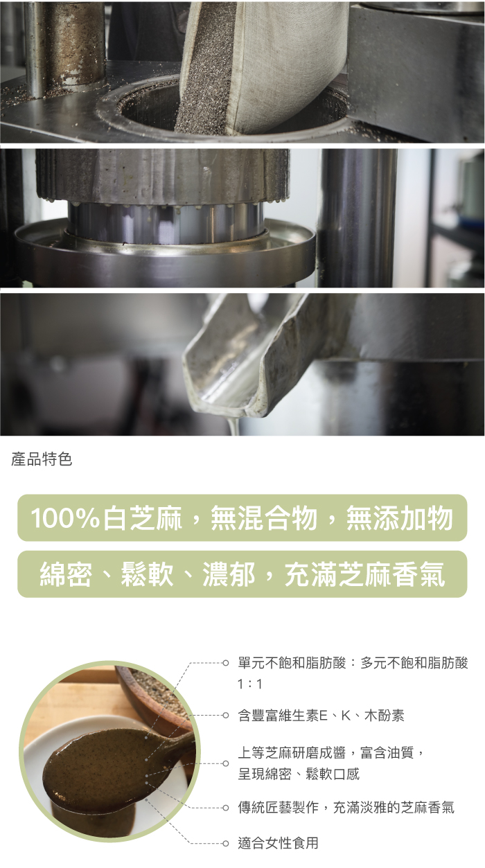 選用上等芝麻研磨,100%無添加,保留芝麻豐富營養,質地柔滑綿密,充滿淡雅芝麻香氣,是調拌醬料最佳幫手 芝麻內含亞麻油酸,是健康的不飽和脂肪酸,可以降低身體膽固醇、清理血管、潤腸通便。